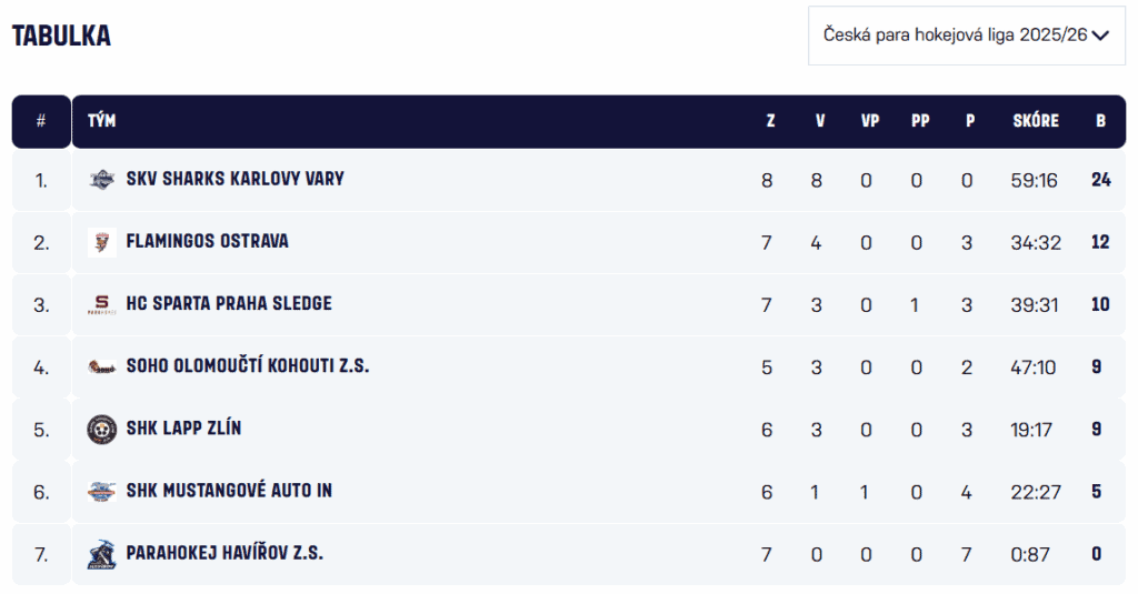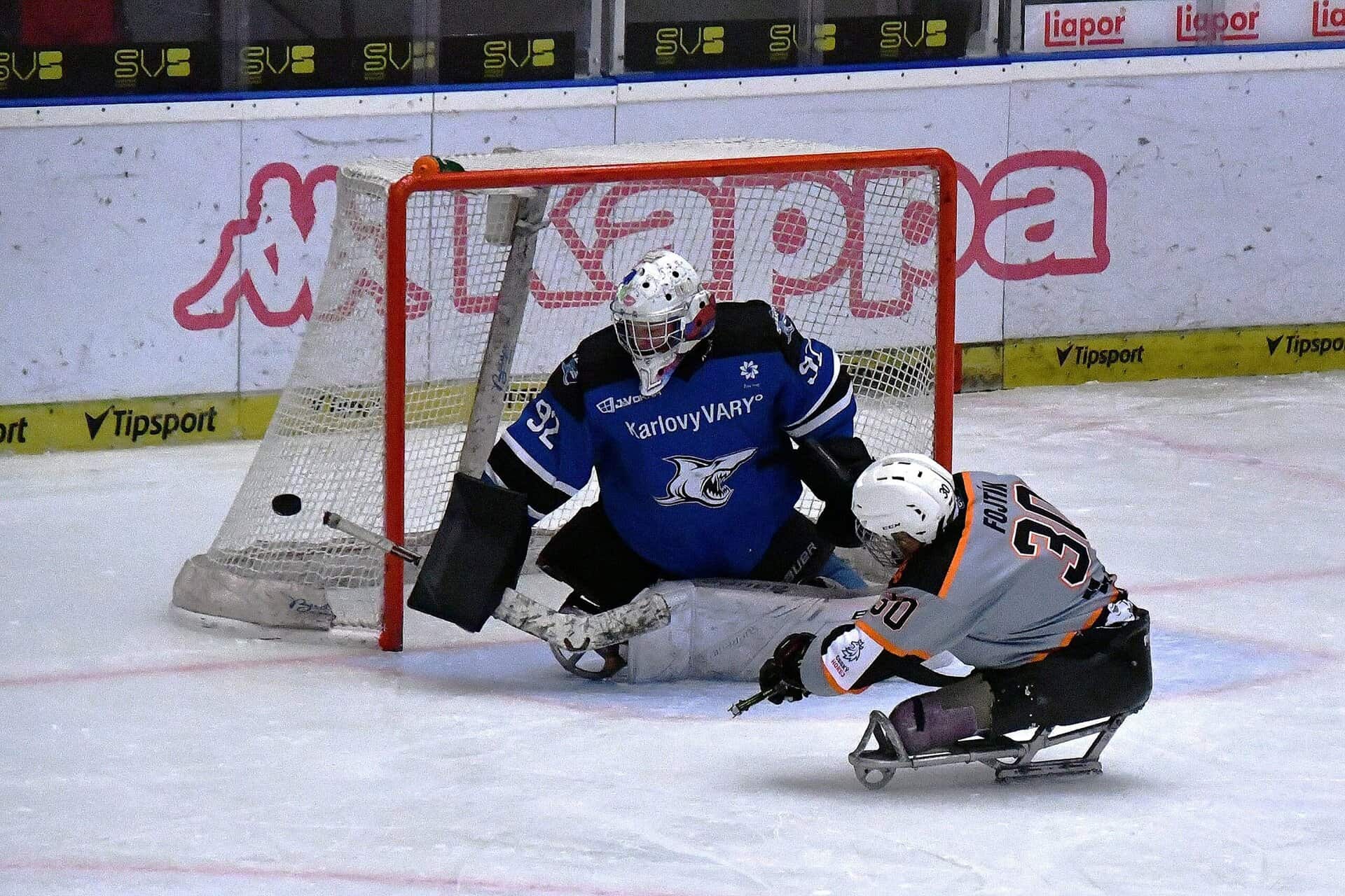 Lídři para hokejové ligy, karlovarští Sharks, sehráli na svém ledě dvě přeložená utkání proti Zlínu. Hostující celek ani jednou nenašel recept na reprezentačního gólmana Patrika Sedláčka a po porážkách 0:1 a 0:4 zůstal na pátém místě tabulky, zatímco dosud nepřemožení Západočeši navýšili svůj náskok na čele na 12 bodů. Mají ale odehráno nejvíc zápasů. Paraliga bude pokračovat kompletním programem 22. a 23. listopadu.
